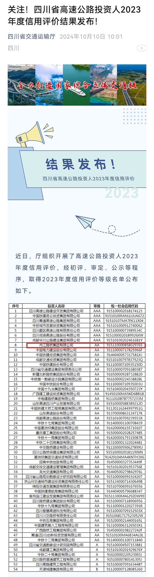 10月10日,四川省交通運輸廳正式發(fā)布公告,內(nèi)江路橋集團(tuán)有限公司(以下簡稱“內(nèi)江路橋集團(tuán)”)成為內(nèi)江市唯一獲評四川省高速公路投資人2023年度信用評價等級AA級企業(yè)。這是繼2020年首次獲評該等級后,連續(xù)第四年蟬聯(lián)AA等級。