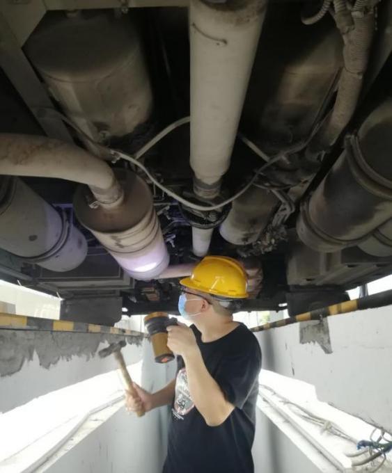 一把榔頭只為堅守源頭安全。在車站車輛例檢處,例檢員劉海正在烈日下作業(yè),滾燙的水泥地面、發(fā)熱的客車底盤和客車尾氣讓車輛例檢臺溫度更高。劉海不停地在車輛底部鉆進(jìn)鉆出,從燈光、轉(zhuǎn)向、制動、底盤,到車胎、螺絲、安全帶、消防錘等,認(rèn)真檢查著每一個車輛部件。客車底部的高溫讓他下去一次便全身濕透一次,臉上的汗也順著頭發(fā)往下滴落。說起自己的工作,劉海認(rèn)為雖然工作環(huán)境惡劣一些,但是與售票員、檢票員并沒有什么不一樣,只是分工不同,做好車輛例檢工作,保障客車運行安全,是我們的責(zé)任,目的都是為旅客出行服務(wù)。